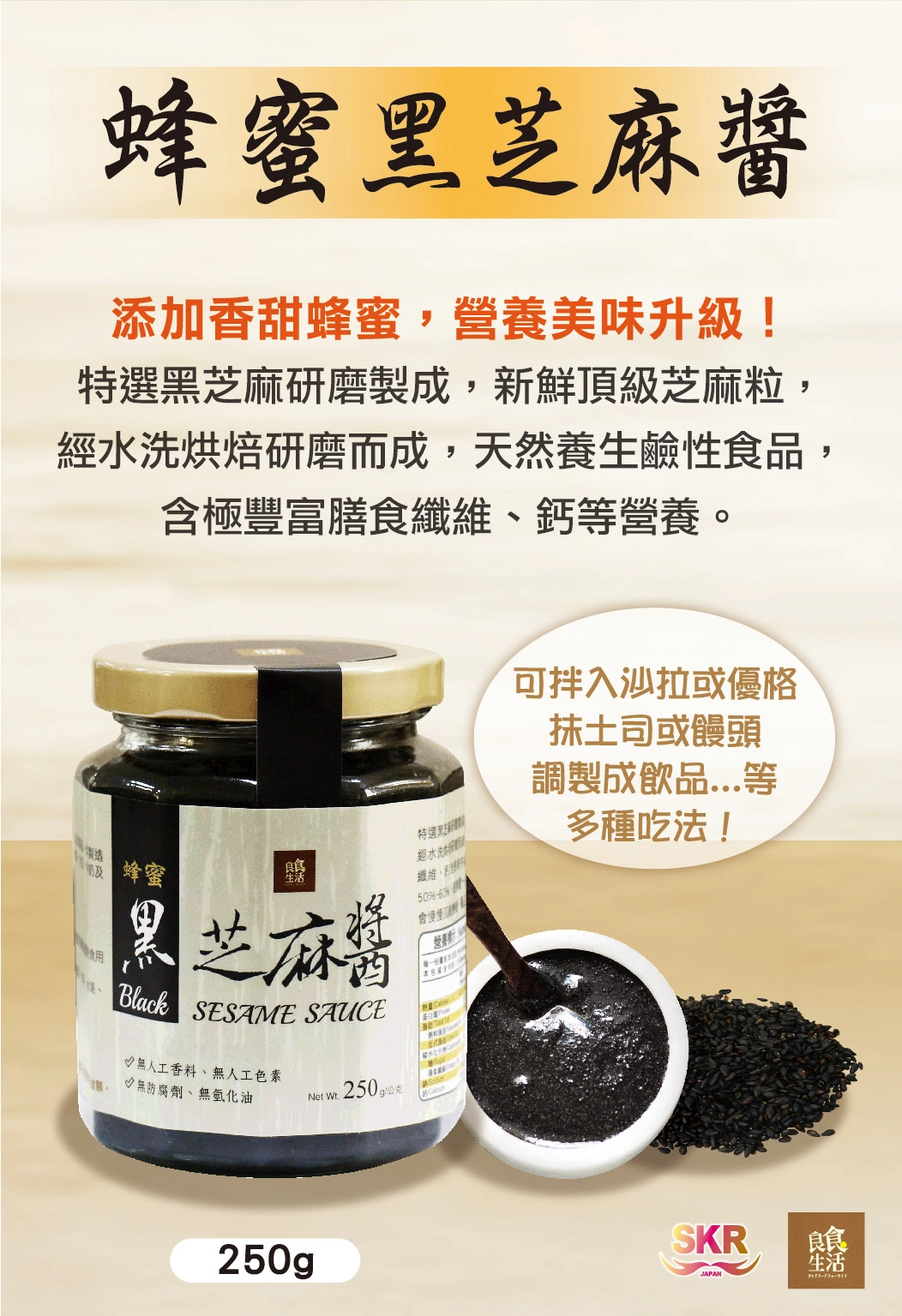 售價$250 添加香甜蜂蜜,營養美味升級! 特選黑芝麻研磨製成,新鮮頂級芝麻粒, 經水洗烘焙研磨而成,天然養生鹼性食品, 含極豐富膳食纖維、鈣等營養。 可拌入沙拉或優格、抹吐司或饅頭、調製成飲品...等多種吃法!